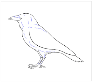 Sketsa ringan pada awalnya, karena Anda akan menghapus beberapa baris ketika Anda melanjutkan. Menambahkan tanda-tanda biru baru untuk gambar Anda sendiri, dan Anda akan segera memiliki gambaran yang lengkap dari gagak. Berikut adalah tutorial cara menggambar burung gagak.